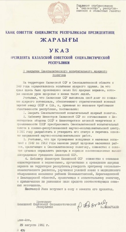 Пресс-служба Первого Президента опубликовала в соцсетях указ Нурсултана Назарбаева о закрытии Семипалатинского испытательного ядерного полигона, передает Tengrinews.