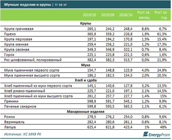 К ноябрю в Казахстане подорожали продукты питания - крупы, мука, хлеб, яйца, мясо, молоко, овощи и фрукты, передает Tengrinews.kz со ссылкой на портал Energyprom.kz. Аналитики портала отмечают, что к ноябрю ожидаемо подорожали сезонные овощи: помидоры подскочили в цене на 12,8 процента за месяц, огурцы - на 11 процентов, чеснок - на 7,7 процента. В то же время подешевели лук, морковь и капуста. Среди фруктов традиционно к зиме дорожают апельсины (плюс 7,6 процента за месяц), лимоны (плюс 1,3 процента) и бананы (плюс 2,6 процента). ![]() Заметный скачок цен отмечен также в сегменте мучных изделий и круп: сразу на 8,6 процента подорожала гречневая крупа, на четыре процента - мука первого сорта, на два процента - высшего, на 1,9 процента выросло в цене пшено, на 1,5 процента и 1,2 процента, соответственно - перловая и манная крупы. Вслед за мукой подорожал и хлеб.
