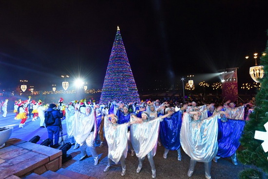 В предновогодней церемонии принял участие аким Алматы Бакытжан Сагинтаев. Главная елка украшена светодиодными гирляндами и новогодними игрушками. Всего в городе установили 9 искусственных елок высотой от 10 до 12 метров.