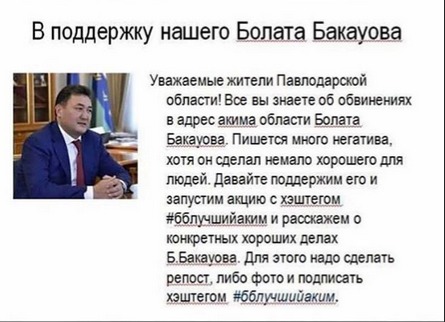 Жители Павлодарской области запустили в соцсетях акцию в поддержку арестованного акима Бакауова, сообщает zakon.kz. Помочь арестованному акиму призван хештег #бблучшийаким. — Дорогие друзья Бакауов Булат Жумабекович сделал много хороших дел для развития своего региона! — говорится в сопроводительном комментарии в Instagram. Жителей области просят вспомнить, что хорошего сделал Бакауов на своей должности и тем возможно повлиять на решение властей в судьбе экс-акима. ![]() На данный момент под хештегом чуть более 300 напоминаний о том, какой Булат Бакауов замечательный аким. Источник: zakon.kz Последние новости: