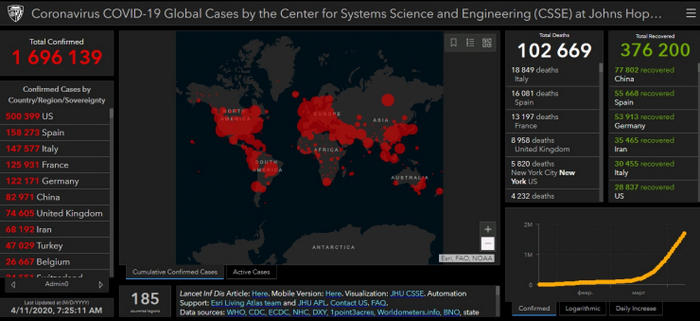 По состоянию на утро 11 апреля число погибших от коронавируса в мире превысило 100 тысяч человек. Об этом информирует университет Джонса Хопкинса (США), который ведет собственную статистику. По данным университета, жертвами COVID-19 стали 102 669 человек, количество заразившихся во всем мире составило 1 696 139 человек, выздоровели более 376 тысяч. В США число подтвержденных случаев заражения превысило полмиллиона, умерли более 18,6 тысячи человек, выздоровели чуть больше 28 тысяч. Как сообщает университет, количство жертв COVID-19 в США за сутки впервые превысило 2,5 тысячи человек. США в настоящий момент на первом месте в мире по числу подтвержденных случаев заражения и на втором после Италии по числу смертей. В пятерку стран с наибольшим количеством инфицированных по прежнему входят Испания (158 тысяч зараженных и 16 тысяч летальных исходов), Италия (147 577 и 18 849), Франция (125 931 и 13 197) и Германия (122 171 и 2767).