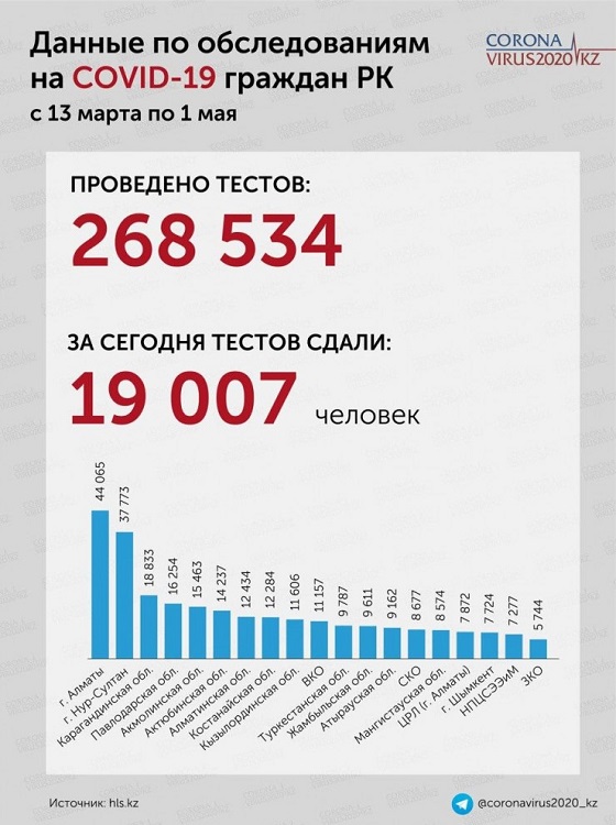 Tengrinews. С 13 марта по 1 мая тест на коронавирусную инфекцию сдали 268 534 раза. За 1 мая тесты прошли 19 007 человек.