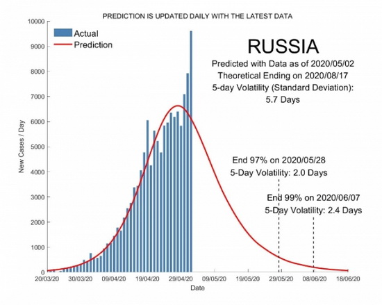![]() В России, согласно выводам ученых, эпидемия полностью утихнет 17 августа, а не 20 июля, как предполагалось в первоначальном прогнозе.