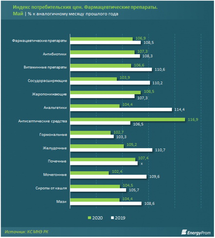 Сообщается, что в январе – апреле фармацевтические компании Казахстана произвели основных фармацевтических продуктов на 41,9 миллиарда тенге, это на 33,9 процента больше, чем в аналогичном периоде 2019 года. Реальный рост с учетом инфляции составил 24,2 процента.