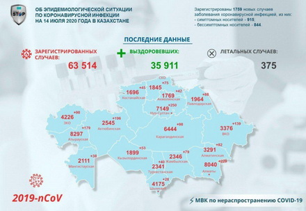 Казахстанские новостиЧисло заражений коронавирусом превысило 63 тысячи в Казахстане (15.07.2020, 10:32), просмотров: 1730За прошедшие сутки в Казахстане выявлены 1759 заболевших коронавирусной инфекцией. Число больных превысило 63 тысячи, передает Tengrinews.kz со ссылкой на МВК.