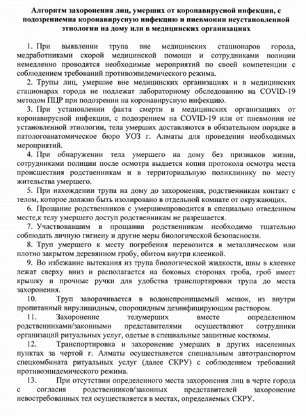 Казахстанские новостиУмерших от неизвестной пневмонии будут хоронить по особым правилам в Алматы (20.07.2020, 09:09), просмотров: 1426В Алматы умерших от "неизвестной" пневмонии пациентов будут хоронить по тем же правилам, что и погибших от коронавирусной инфекции, передает Tengrinews.kz со ссылкой на постановление главного государственного санитарного врача города Жандарбека Бекшина.
