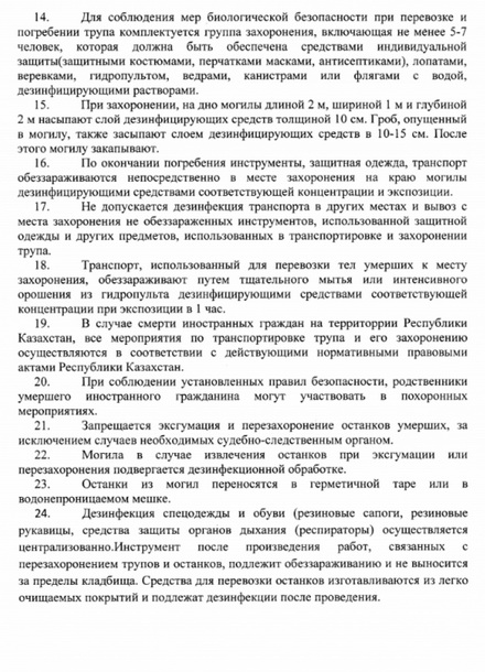 "Алгоритм захоронения лиц, умерших с подозрением на коронавирусную инфекцию из очага и с обнаружением коронавирусной инфекции, заменить на алгоритм захоронения лиц, умерших от коронавирусной инфекции, с подозрением на коронавирусную инфекцию и пневмонии неустановленной этиологии на дому или в медицинских организациях", - говорится в документе.