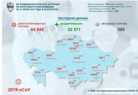 Казахстанские новостиБолее 1,5 тысячи новых случаев коронавируса зарегистрированы в Казахстане (28.07.2020, 09:37), просмотров: 1579В Казахстане по состоянию на 27 июля зарегистрировано 1526 новых случаев заболевания коронавирусной инфекцией, передает Tengrinews.kz со ссылкой на МВК по нераспространению COVID-19.