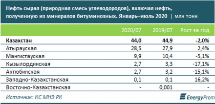 За январь - июль 2020 года объем добычи сырой нефти составил 44 миллиона тонн, что на два процента меньше, чем год назад. В денежном выражении объем добычи составил 4,5 триллиона тенге.