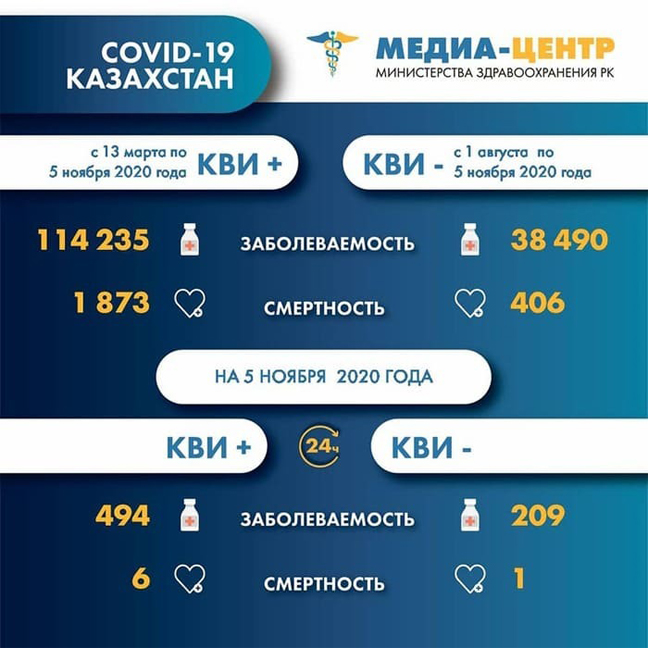Казахстанские новостиНовые случаи смерти от КВИ и пневмонии зарегистрированы в Казахстане (05.11.2020, 10:41), просмотров: 1275В Казахстане 4 ноября от коронавирусной инфекции скончались семь человек, передает Azattyq Rýhy со ссылкой на пресс-службу Министерства здравоохранения РК. 4 ноября от COVID-19 скончались шесть человек, от коронавирусной пневмонии – один. С 13 марта по 4 ноября включительно в республике от коронавирусной инфекции умерли 1 873 человека. С 1 августа по 4 ноября включительно зарегистрированы 406 случаев смерти от пневмонии с признаками COVID-19 и при отрицательном ПЦР-тесте. 4 ноября выявлены 494 новых случая заболевания коронавирусной инфекцией. К этому часу в Казахстане зарегистрированы 114 235 случаев заболевания COVID-19, выздоровели 107 139 человек. На данный момент лечение от COVID-19 продолжают получать 5 223 человека, в том числе 340 детей. В стационарах находятся 2 572 пациента, на амбулаторном уровне — 2 651. 148 человек находятся в тяжелом состоянии, 25 — в состоянии крайней степени тяжести, 26 — на аппаратах искусственной вентиляции легких. По информации Межведомственной комиссии по нераспространению COVID-19, 4 ноября зарегистрированы 209 случаев заболевания пневмонией с признаками COVID-19 и при отрицательном ПЦР-тесте, за сутки выздоровели 64 человека. С 1 августа по 4 ноября включительно в республике выявлены 38 490 случаев заболевания коронавирусной пневмонией, выздоровели 28 963 человека. Последние новости: