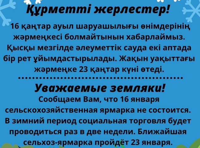Городские новостиВ субботу сельскохозяйственной ярмарки в Павлодарской области не будет (12.01.2021, 17:49), просмотров: 2365Причиной стало изменение графика проведения. Как сообщили в областном управлении сельского хозяйства, 16 января сельскохозяйственная ярмарка не состоится, передает корреспондент Pavlodarnews.kz. — В зимний период социальная торговля будет проводиться раз в две недели. Ближайшая сельхозярмарка пройдет 23 января, — говорится в сообщении ведомства. Последние новости: