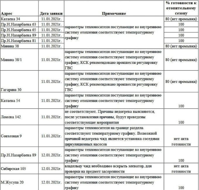 Заявку в тепловую инспекцию подают обслуживающие организации по месту жительства. Заявки тепловики получили 11 и 12 января 2021 года, передает корреспондент Pavlodarnews.kz. — Это список домов, представители КСК которых обратились в тепловую инспекцию «Тепловых сетей» по вопросу недогрева. Данные списки будут публиковаться регулярно на официальной странице компании и в Телеграм-канале. Очередной список домов мы планируем разместить 15 января. Напоминаем, что заявку в тепловую инспекцию подают обслуживающие организации по месту жительства, — сказали на предприятии.