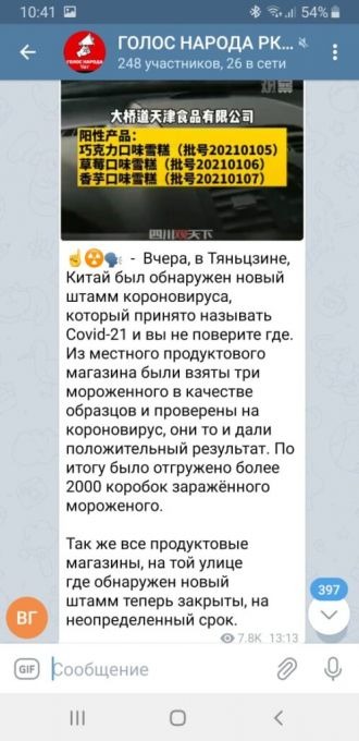 Казахстанские новостиНовый штамм коронавируса в китайском мороженом: Разоблачение фейка (19.01.2021, 17:05), просмотров: 2384В Telegram-каналах казахстанцы делятся новостью о том, что новый штамм коронавируса обнаружили в партии мороженого в муниципалитете Тяньцзинь в Китае. Портал stopfake.kz объяснил, почему эта информация, а также новости о COVID-21 - неправда, передает zakon.kz. В пересылаемом сообщении сказано, что мороженое, в котором обнаружился вирус, взяли в продуктовом магазине. Причем проверили всего три рожка. После обнаружения в них COVID-21 все продуктовые магазины на улице, в которых обнаружили инфицированное лакомство, закрыли на неопределенный срок. Вероятнее всего, фейковое сообщение базируется на новости о том, что в партии мороженого в Китае действительно нашли коронавирус. Но не новый штамм, а SARS-CoV-2, вызывающий COVID-19. Стивен Гриффин, вирусолог из Университета Лидса, склонен считать, что это разовый случай. Его причиной, вероятно, стал контакт зараженного с сырьем, из которого производят мороженое. Всю партию десертов изъяли и изолировали. Покупателей сейчас ищут, чтобы установить возможные случаи заражения. О закрытии продуктовых магазинов не сообщалось. Таким образом, сообщения о новом штамме коронавируса, вызывающего болезнь COVID-21, — фейк. Последние новости: