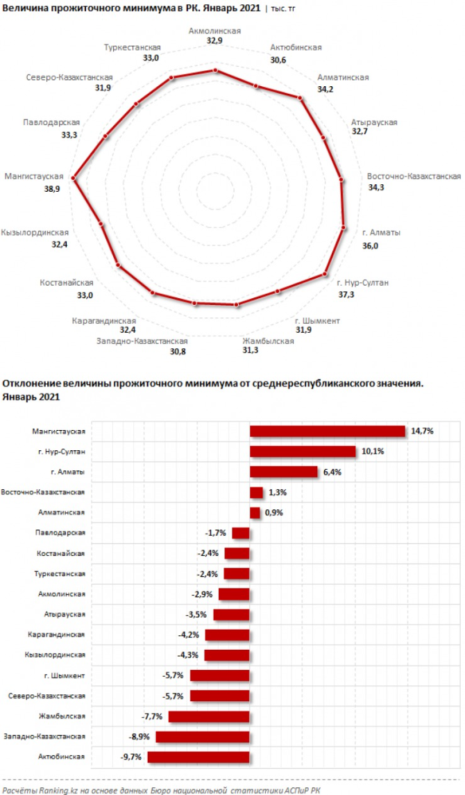 Казахстанские новости«Продуктовый» прожиточный минимум казахстанцев составил 19 тысяч тенге - аналитики (04.02.2021, 12:36), просмотров: 12923Прожиточный минимум казахстанцев в январе 2021 года составил 33,9 тысячи тенге. Из них на продукты заложено менее 19 тысяч тенге, передает Tengrinews.kz со ссылкой на аналитический портал Ranking.kz. Сообщается, что в январе величина прожиточного минимума составила 33,9 тысячи тенге — на 12,7 процента больше, чем в аналогичном периоде 2020 года. В свою очередь, цены на товары и услуги выросли на 7,4 процента. В структуре прожиточного минимума на продовольственную корзину приходится 18,6 тысячи тенге, на непродовольственные товары и услуги — 15,2 тысячи тенге, сообщают аналитики. В региональном разрезе наибольшая величина прожиточного минимума традиционно приходится на Мангистаускую область: 38,9 тысячи тенге. Это на 14,7 процента больше среднереспубликанского уровня. В Нур-Султане прожиточный минимум составил 37,3 тысячи тенге (на 10,1 процента больше, чем в среднем по стране), в Алматы — 36 тысяч тенге (на 6,4 процента больше, чем в среднем по стране). В целом только в пяти регионах величина прожиточного минимума превысила среднее по Казахстану значение. Тем временем наименьший размер прожиточного минимума наблюдается в Актюбинской области: 30,6 тысячи тенге — на 9,7 процента меньше среднереспубликанского уровня. Одни из самых небольших сумм прожиточного минимума приходятся также на Западно-Казахстанскую (30,8 тысячи тенге) и Жамбылскую (31,3 тысячи тенге) области. Последние новости: