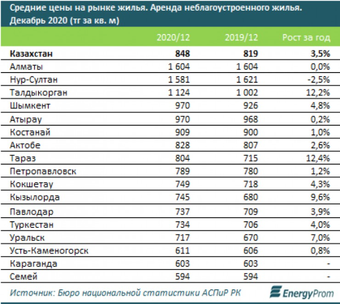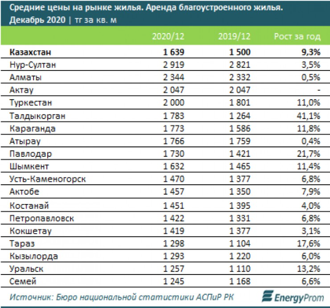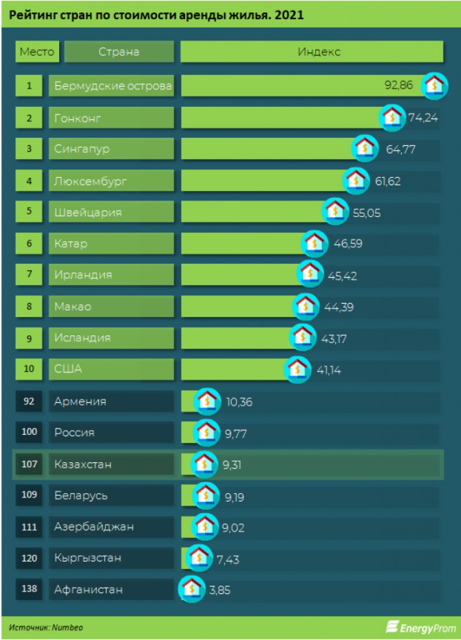 Казахстанские новостиКазахстан вошел в число стран с дешевой арендой жилья (05.02.2021, 11:51), просмотров: 3677В Казахстане стоимость аренды благоустроенного жилья выросла за год на девять процентов, а неблагоустроенного - на четыре процента. При этом Казахстан остается одной из дешевых по стоимости аренды жилья стран: мы в этом рейтинге занимаем 107-е место из 138, передает Tengrinews.kz со ссылкой на Energyprom.kz. В рейтинге стран мира по стоимости аренды жилья Казахстан на начало 2021 года занял 107-е место из 138. Рейтинг оценивает, насколько дороже или дешевле обходится аренда в странах относительно Нью-Йорка, индекс которого составляет 100. Если индекс страны составляет 110, значит, аренда там обходится на 10 процентов дороже, чем в Нью-Йорке. Если меньше, например, 95 процентов, — то на пять процентов дешевле относительно этого американского мегаполиса, поясняют аналитики. Индекс Казахстана в этом рейтинге составил всего 9,31. Открывают рейтинг страны с самой дорогой арендой жилья: Бермудские острова, Гонконг, Сингапур. Самое дешевое жилье в аренду, по данным рейтинга, можно найти в Афганистане. ![]() При этом в декабре 2020 года средняя стоимость аренды благоустроенного жилья в Казахстане составила 1,6 тысячи тенге за квадратный метр — на 9,3 процента больше, чем годом ранее. По сравнению с ноябрем стоимость аренды благоустроенного жилья выросла на 1,2 процента. Среди крупных городов и мегаполисов страны самые высокие в секторе цены на аренду в Нур-Султане (2,9 тысячи тенге), Алматы (2,3 тысячи тенге) и Актау (2 тысячи тенге). А самые низкие в Семее (1,2 тысячи тенге за квадратный метр). ![]() Средняя стоимость аренды неблагоустроенного жилья составила 848 тенге за квадратный метр — на 3,5 процента дороже, чем годом ранее. За месяц стоимость аренды выросла незначительно — на 0,5 процента. Самые высокие цены на неблагоустроенное жилье наблюдаются в Алматы (1,6 тысячи тенге), Нур-Султане (1,6 тысячи тенге) и Талдыкоргане (1,1 тысячи тенге за квадратный метр). Последние новости: