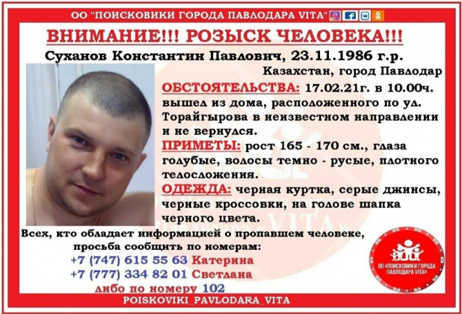 Городские новостиОставившего предсмертную записку павлодарца разыскивают волонтеры и полиция (17.02.2021, 16:44), просмотров: 280417 февраля 2021 года мужчина ушел из дома по улице Торайгырова в областном центре в неизвестном направлении. Как рассказали в ОО «Поисковики города Павлодара VITA», документы и ключи от квартиры 35-летний Константин Суханов оставил дома, так же как и свой сотовый телефон, в котором было найдено его видеообращение к родным, передаёт корреспондент Pavlodarnews.kz. В нем он просит прощения у семьи за свой поступок, а также поручает оформить его пенсионные начисления для расплаты с долгами. Если родные видят это обращение, значит, его уже нет в живых, говорит мужчина в видеопослании. — Рост мужчины 165-170 см, голубые глаза, темно-русые волосы, плотного телосложения, — уточнили поисковики. — Был одет в черную куртку, серые джинсы, черную шапку. Всех, кто имеет какую-либо информацию о пропавшем, просят сообщить по номерам 102 или 8 747 615 55 63, 8 777 334 82 01. Известного, что мужчина работает на одном из крупных предприятий Павлодара, воспитывает сына. Последние новости:
