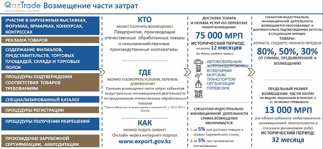 Вопросами экспорта в Казахстане занимается «Центр развития торговой политики «KazTrade». Как подчеркнул генеральный директор компании Азамат Аскарулы, отечественных производителей поддерживают на шести этапах. Сначала им предлагают консультации и анализируют бизнес-процесс. После экспортёры могут воспользоваться программой акселерации, возместить часть затрат, выйти на мировые электронные площадки, получить сервисную и финансовую поддержку.