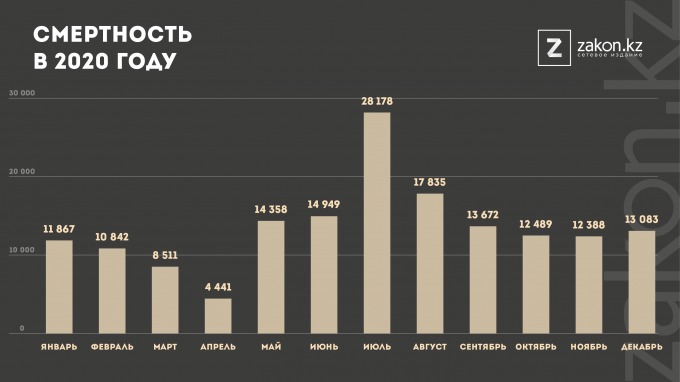 Казахстанские новостиЧем Минздрав объясняет рекорд смертности в Казахстане в 2020 году (16.03.2021, 13:10), просмотров: 3931Бюро нацстатистики опубликовало статистику по смертям за 2020 год. За прошлый год в стране умерло на 29 тысяч человек больше, чем в 2019-м. При этом от коронавируса официально скончалось 2 865 человек. Больше всего люди умирали летом – в пик эпидемии. Меньше всего – весной, когда в республике действовал локдаун. Чем Минздрав объясняет увеличение смертности и в каком регионе Казахстана больше всего умерло казахстанцев, рассказывает zakon.kz. Согласно статистике, в прошлом году умерло 162 613 казахстанцев. Это самый высокий показатель за прошедшее десятилетие: умерло примерно на 20-30 тысяч больше, чем в предыдущие годы. Больше всего скончались в Восточном Казахстане (16 655), Алматинской области (16 234), Карагандинской области (15 639), городе Алматы (14 620), а также Туркестанской области (13 007). От чего умирали казахстанцы в прошлом году. В Бюро национальной статистики сообщают, что основными причинами смерти являются: — болезни системы кровообращения: ишемическая болезнь сердца, стенокардия, инфаркт миокарда, сосудистое поражение мозга и другие; — болезни органов дыхания: грипп, острые респираторные заболевания, пневмония; — болезни органов пищеварения: гастрит, гепатит, панкреатит, холецистит; — инфекционные и паразитарные болезни. Но при этом меньше умирали от ДТП, несчастных случаев, отравлений и травм. Уменьшилось также число убийств и самоубийств. В Бюро нацстатистики также ведется учет умерших по национальному признаку. Согласно нему, первое место по количеству умерших занимают казахи (81 004), на втором месте русские (51 124), на третьем — украинцы (9 088). В каком месяце больше всего умирали. Больше всего казахстанцев умерло в июле — в пик заразности коронавируса. Меньше всего смертей зарегистрировали в апреле, когда в стране действовал режим ЧП. ![]() Чем Минздрав объясняет избыточную смертность? Избыточная смертность в Казахстане в 2020 году, как и в большинстве стран мира, связана со смертностью от коронавирусной инфекции, а также со смертностью от хронических заболеваний, — говорится в ответе Минздрава на запрос редакции. В ведомстве объясняют, что во время первой волны коронавируса больницы и республиканские научные центры, оказывающие плановую медицинскую помощь, были частично перепрофилированы в инфекционные и провизорные стационары. Плановую медицинскую помощь были вынуждены приостановить. Однако помощь продолжали получать беременные, больные с онкологическими и другими социально-значимыми заболеваниями. Одним из факторов, повлиявших на увеличение смертности, являлась возросшая нагрузка на систему здравоохранения, недоступность жизненно важной медицинской помощи в период пика пандемии, а также стрессовая реакция населения во время пандемии, — признали в Минздраве. Эксперт о причинах высокой смертности. Консультант в сфере здравоохранения Али Нургожаев согласен с тем, что высокая смертность частично связана со снижением доступности медпомощи в период карантина. Вместе с тем эксперт отмечает, что из 29 тысяч «дополнительных» в 2020 году смертей наибольшее влияние на статистику оказали две группы заболеваний: — грипп / ОРЗ / пневмония — 6 783 смерти, — болезни системы кровообращения — 6 262 смерти. Также в основные причины смерте