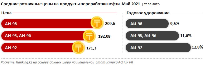 Казахстанские новостиВ Казахстане снова взлетели цены на бензин (14.06.2021, 11:51), просмотров: 3788Цены на бензин вновь подорожали в Казахстане. Аналитики отмечают, что несмотря на карантин, продажи бензина и прочих нефтепродуктов сократились за "коронакризисный" год всего на 2%, сообщает zakon.kz. Почти две трети объемов розничной торговли нефтепродуктами на АЗС, АГЗС и АГНКС в стоимостном выражении пришлись на бензин: 704,1 млрд тг, что в натуральном выражении составило почти 3,9 млн тонн, — говорится в сообщении Ranking.kz. Следом идет дизельное топливо. Среди регионов наибольшие объемы розничной торговли нефтепродуктами пришлись на Алматинскую область (129,7 млрд тг), Алматы (110 млрд тг) и Карагандинскую область (105,5 млрд тг). Наибольший объем розничной торговли бензином пришелся на марку АИ-92: 579,6 млрд тг, или 3,3 млн тонн, — отмечают исследователи. Следом идет АИ-95: 115,7 млрд тг, или 595,5 тыс. тонн. На марки бензина АИ-96 и АИ-98 пришлось 2,6 млрд и 6,2 млрд тг соответственно. Средние розничные цена на бензин выросли по всем маркам. Так, за год наиболее востребованный бензин АИ-92 вырос в цене к маю 2021 года до 171,3 тг за литр (+12,8% за год). Бензин марки АИ-95/96 подорожал до 192,1 тг за литр (+11,6%), а АИ-95 — до 209,6 тг за литр (+9,5%), — уточнили эксперты. Крупнейшие АЗС страны были уличены в ценовом сговоре и установке необоснованных цен на самый популярный у казахстанцев бензин АИ-92. Антимонопольным органом было отправлено 14 уведомлений сетям АЗС. Последние новости: