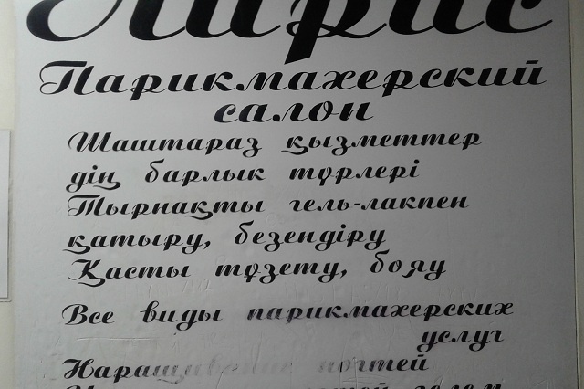 ![]() В ТД «Сенім» же положение дел оказалось не столь радужным. Визуальная информация некоторых бутиков выполнена с грубыми грамматическими ошибками как на казахском, так и на русском языках. Даже надпись на фасаде «сауда үйі» ошибочно записано как «сауда уйі».