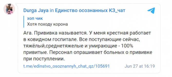 Казахстанские новостиFake: COVID-госпитали заполнены умирающими людьми, получившими вакцину (30.06.2021, 12:46), просмотров: 4696Сообщение о том, что COVID-госпитали заполнены тяжелобольными и умирающими людьми, получившими вакцину против КВИ, появилось в казахстанском Telegram-канале. Эту информацию опровергли в Министерстве здравоохранения Казахстана, передает Tengrinews.kz со ссылкой на StopFake. В Казахстане действительно регистрируются случаи заражения COVID-19 среди привитых людей, но их количество минимальное. «В Казахстане из 3 246 795 человек, получивших вакцину, заболели COVID-19 0,05 процента», — сообщили в Министерстве здравоохранения РК. Также в ведомстве отметили, что большинство заражений зарегистрированы среди тех, кто успел получить всего одну дозу препарата, то есть иммунитет против КВИ у них еще не был сформирован полностью. Отметим, что в США, по данным Центра контроля и профилактики заболеваний, на 21 июня 2021 года было зарегистрировано 4 115 случаев заражения среди людей, получивших вакцину. Это составляет 0,002 процента от общего числа привитых на тот момент людей. Эти показатели соответствуют заявленной эффективности вакцин. Для препарата Pfizer/BioNTech она составляет 91 процент, Moderna — 94 процента, AstraZeneca — 74 процента, «Спутник V» — 92 процента, Sinopharm (Hayat-Vax) — 73 процента. Последние новости: