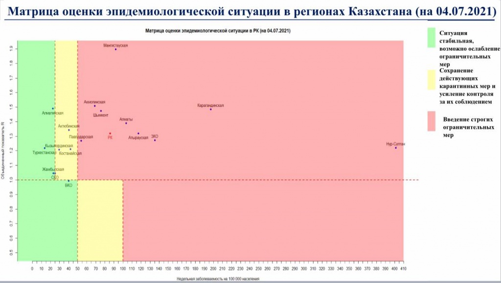 «Зелёными» остались Алматинская, Восточно-Казахстанская, Жамбылская, Туркестанская области и Северо-Казахстанская области.