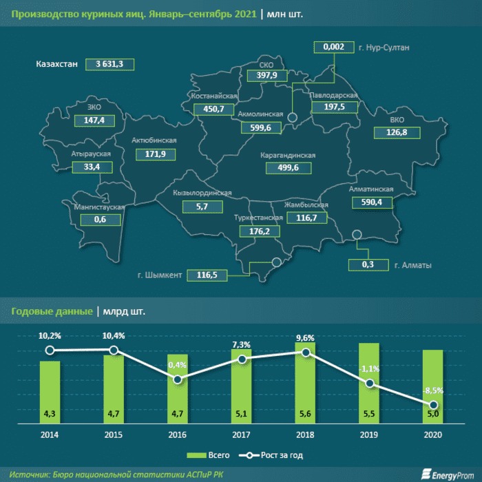 Казахстанские новостиНа 16% подорожали яйца в Казахстане за год (26.10.2021, 16:35), просмотров: 4185Производство этого продукта в стране сокращается, а импорт – растет. Казахстанские фермеры в январе-сентябре 2021 года получили 3,6 млрд яиц, что на 9% меньше, чем годом ранее, передает Azattyq Rýhy со ссылкой на Еnergyprom.kz. Из них 2,3 млрд яиц реализовали через торговые сети и пункты общественного питания, 44,5 млн штук отправили на экспорт, 4,6 млн яиц реализовали перерабатывающим компаниям. Производственное потребление составило 94,3 млн яиц, переработка на продовольственные цели — 7,6 млн штук В разрезе регионов наибольшие объемы выпуска в секторе пришлись на Акмолинскую область: 599,6 млн штук, минус 4,9% за год. В тройке лидирующих регионов также оказались Алматинская область (590,4 млн штук, минус 24,6%) и Карагандинская область (499,6 млн штук, минус 0,6%). В целом за 2020 год в РК произвели 5 млрд яиц, что на 8,5% меньше, чем в 2019-м. По итогам января-августа 2021 года местные компании обеспечили спрос (реализация на внутреннем рынке плюс экспорт) на свежие яйца в скорлупе на 94,4%, против 97,3% годом ранее. На импорт соответственно пришлось уже 5,6% ресурсов. В страну с начала года завезли 189,3 млн яиц — сразу почти вдвое больше, чем в январе-августе 2020 года. В то же время экспорт, напротив, сократился более чем вдвое за год, до всего 83,4 млн яиц. Реализация на внутреннем рынке также уменьшилась и составила 3,3 млрд яиц, минус 4,9% за год. В сентябре этого года средняя цена десятка яиц первой категории достигла 355 тенге, что на 16,4% выше, чем годом ранее. Самые высокие цены в стране среди крупных городов и мегаполисов зафиксированы в Алматы (486 тенге за десяток яиц), Нур-Султане (432 тенге) и Талдыкоргане (405 тенге), самые низкие — в Караганде (262 тенге). В региональном разрезе рост цен в годовой динамике сильнее всего ощутили жители Алматинской области — сразу на 27%. Резкое удорожание ударило также по Жамбылской области (на 25,5%) и Алматы (на 21,6%). Наименьший рост был зарегистрирован в Кызылординской области (на 2,9%). В Ассоциации яичных производителей Казахстана заявили о бесконтрольном импорте яиц из России. Чаще всего это происходит летом, когда в стране и так падает спрос. В профильной ассоциации считают, что продукцию завозят по «серым» схемам, не оплачивая НДС. С падением производства на местных птицефабриках предприниматели еще сильнее почувствовали высокую конкуренцию. Снижение объемов казахстанского производства — одна из причин роста цен на продукцию, отмечает президент объединения Максим Божко. На себестоимости продукции отражаются и дорожающие корма. Также влияет снижение государственной поддержки отрасли, сообщили в ассоциации. Последние новости: