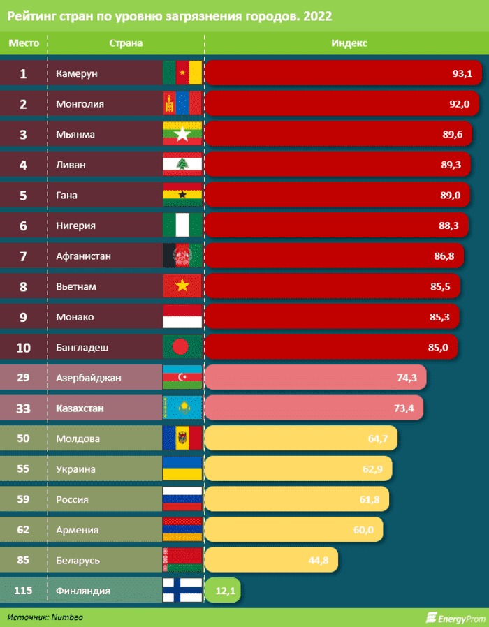 Казахстанские новостиКазахстан попал в рейтинг худших стран по загрязнению городов (07.02.2022, 12:45), просмотров: 3604В рейтинге стран по уровню загрязнения городов Казахстан занял 33-е место из 115 в мире. Индекс загрязнения составил 73,4, передает Azattyq Rýhy со ссылкой на Еnergyprom.kz. Открывают рейтинг самых загрязненных стран Камерун, Монголия и Мьянма, замыкает Финляндия с индексом всего 12,1, что является лучшим показателем в мире. Чем больше индекс, тем хуже ситуация. Среди стран СНГ, участвующих в рейтинге, хуже, чем в Казахстане, ситуация в Азербайджане; лучше — в Молдове, Украине, России, Армении и Беларуси. По итогам 2021 года капитальные инвестиции, направленные на охрану окружающей среды, выросли на 4,3%, до 163,9 млрд тенге. Для сравнения: в 2020 году инвестиции в секторе составили 157,1 млрд тенге, плюс 33,8% за год. В региональном разрезе наибольший объем капитальных инвестиций в секторе отмечен в Жамбылской области: 52,8 млрд тенге, что в 4 раза больше, чем годом ранее. В тройке лидирующих регионов также оказались столица (26 млрд тенге, рост в 7 раз за год) и Актюбинская область (19,8 млрд тенге, рост в 2 раза). В топ-5 регионов также вошли Атырауская и Восточно-Казахстанская области. Наименьший объем капвложений зафиксирован в Алматинской области — 579,6 млн тенге. В Северо-Казахстанской области в прошлом году инвестиций в секторе не наблюдалось. Последние новости: