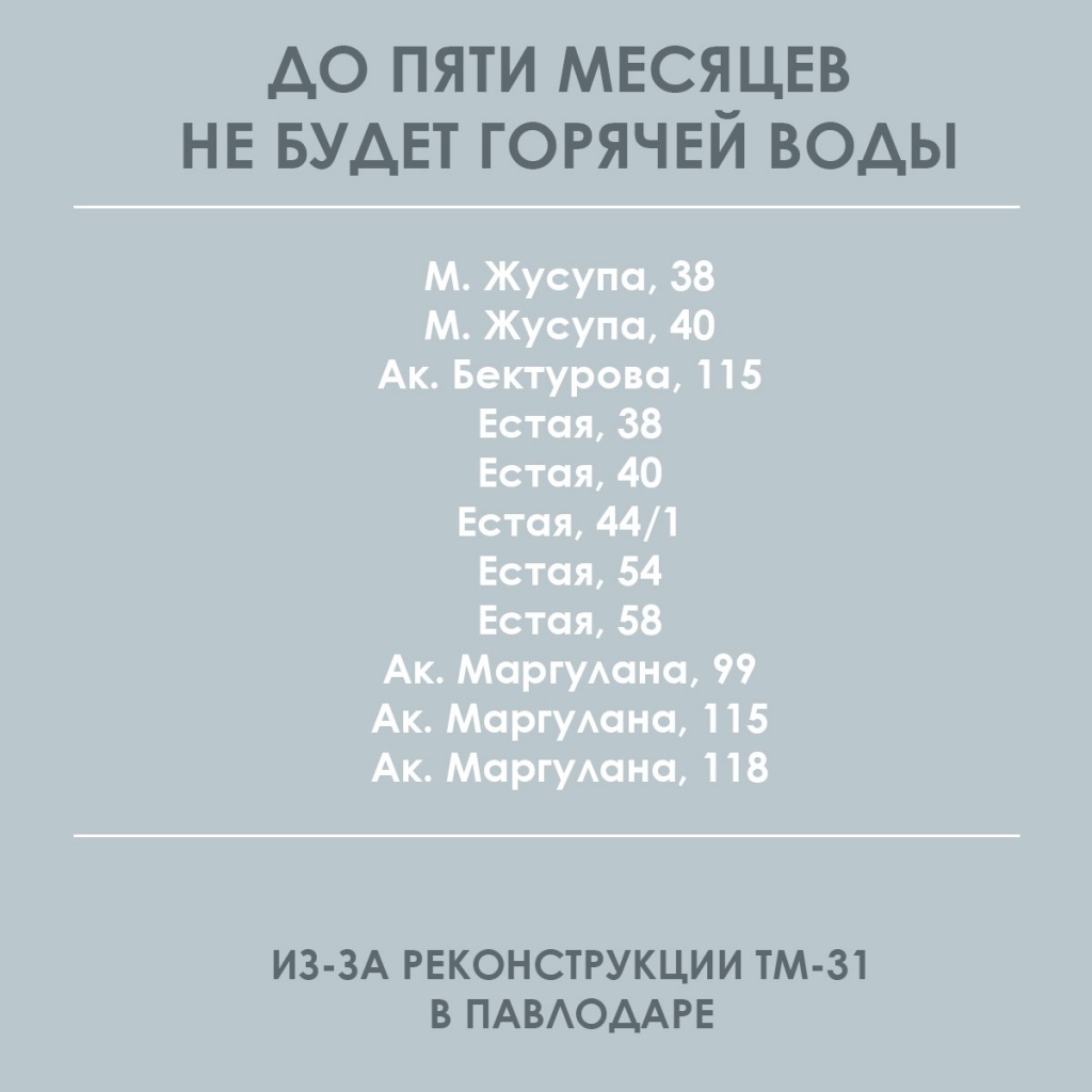 Остальные 42 дома попадают в квадраты капитального ремонта ТОО «Павлодарские тепловые сети» и строительства тепломагистрали 31. Если в первом случае горячей воды не будет до четырех месяцев, то во втором – до пяти.