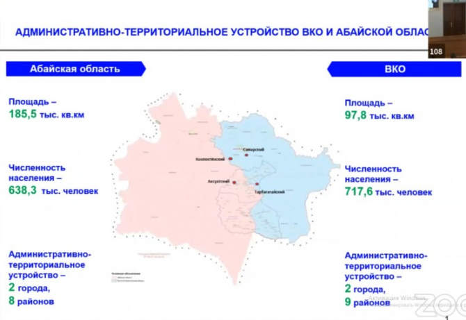 Согласно плану, площадь создаваемой Абайской области составит 185,5 тысячи квадратных километров. Численность населения региона составит 638 тысяч человек.