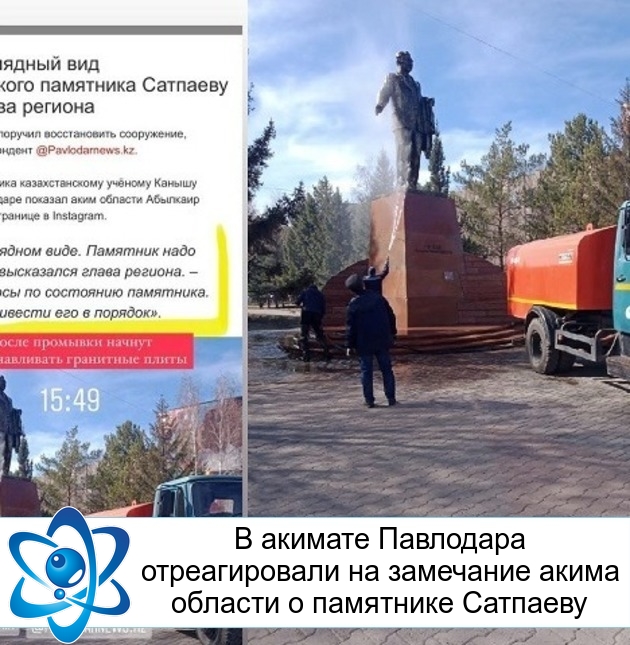 Городские новостиВ акимате Павлодара отреагировали на замечание акима области о памятнике Сатпаеву (12.04.2022, 17:00), просмотров: 1733Монумент уже помыли и готовятся к реставрации. Глава региона Абылкаир Скаков в своем Instagram указал на неприглядный вид памятника академику Канышу Сатпаеву и дал поручение привести его в порядок. Через два часа стало известно: ситуацию частично исправили, передает корреспондент Pavlodarnews.kz. О выполнении задания сообщил аким города Асаин Байханов на своей странице. Судя по опубликованной фотографии, памятник уже помыли. «После промывки начнут восстанавливать гранитные плиты», — написал градоначальник в соцсетях. Источник: pavlodarnews.kz Последние новости: