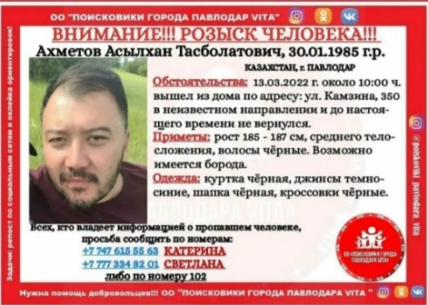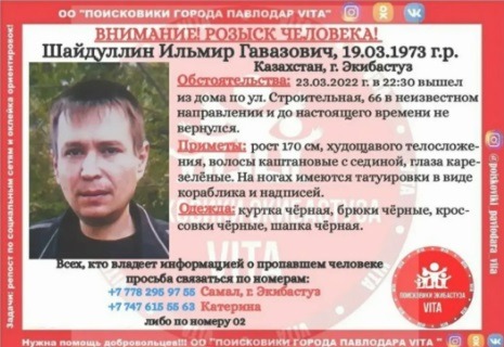 Все они исчезли в разное время и при разных обстоятельствах. Как сообщили волонтеры отряда «VITA», поисковые мероприятия по каждому пропавшему пока не принесли никаких результатов, передает корреспондент Pavlodarnews.kz. Общественники просят всех неравнодушных граждан, если у кого-то есть какая-либо информация о ком-нибудь из пропавших или известно об их местонахождении, незамедлительно сообщить по номерам: +7 (747) 615 55 63 Катерина, +7 (777) 334 82 01 Светлана.